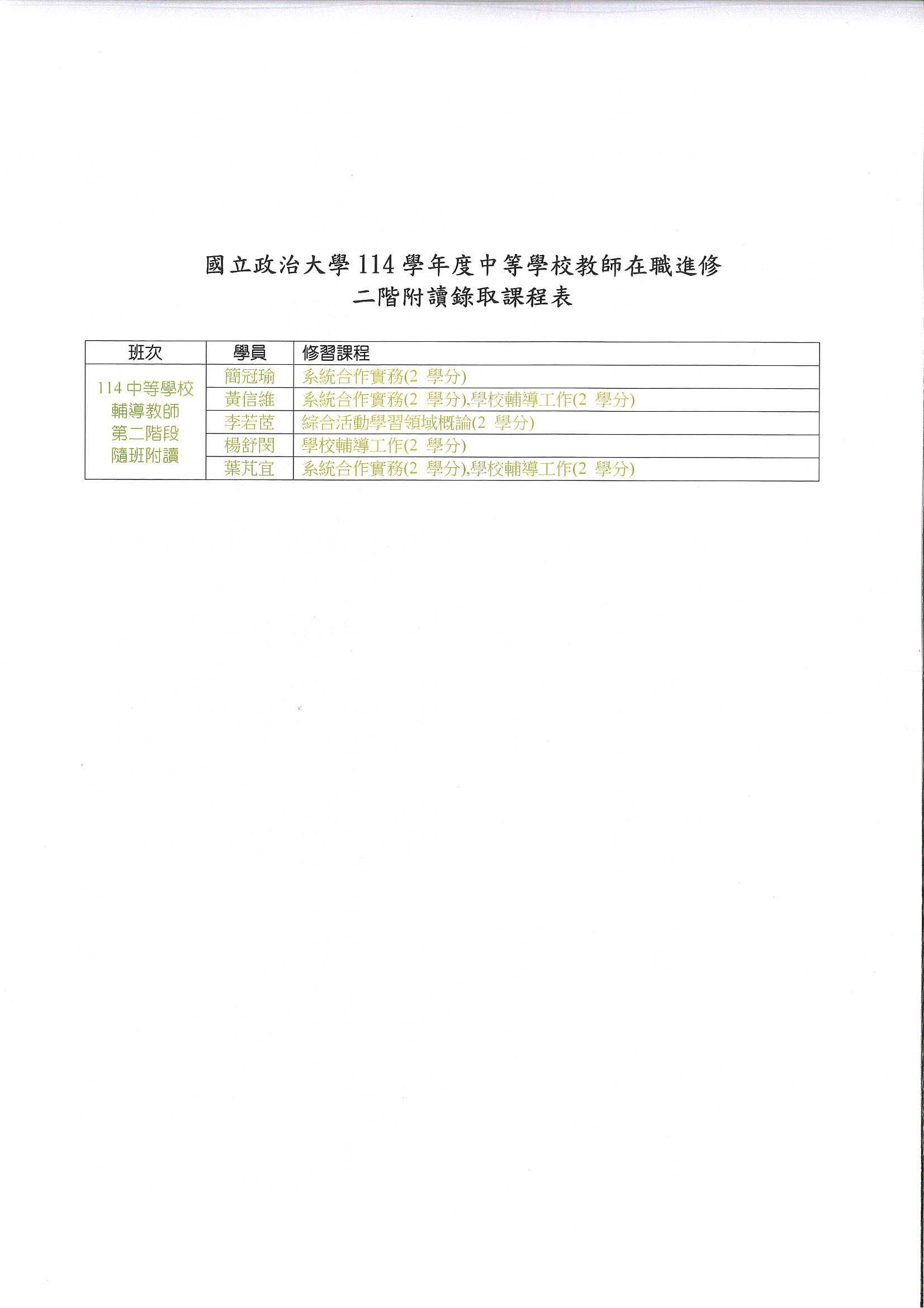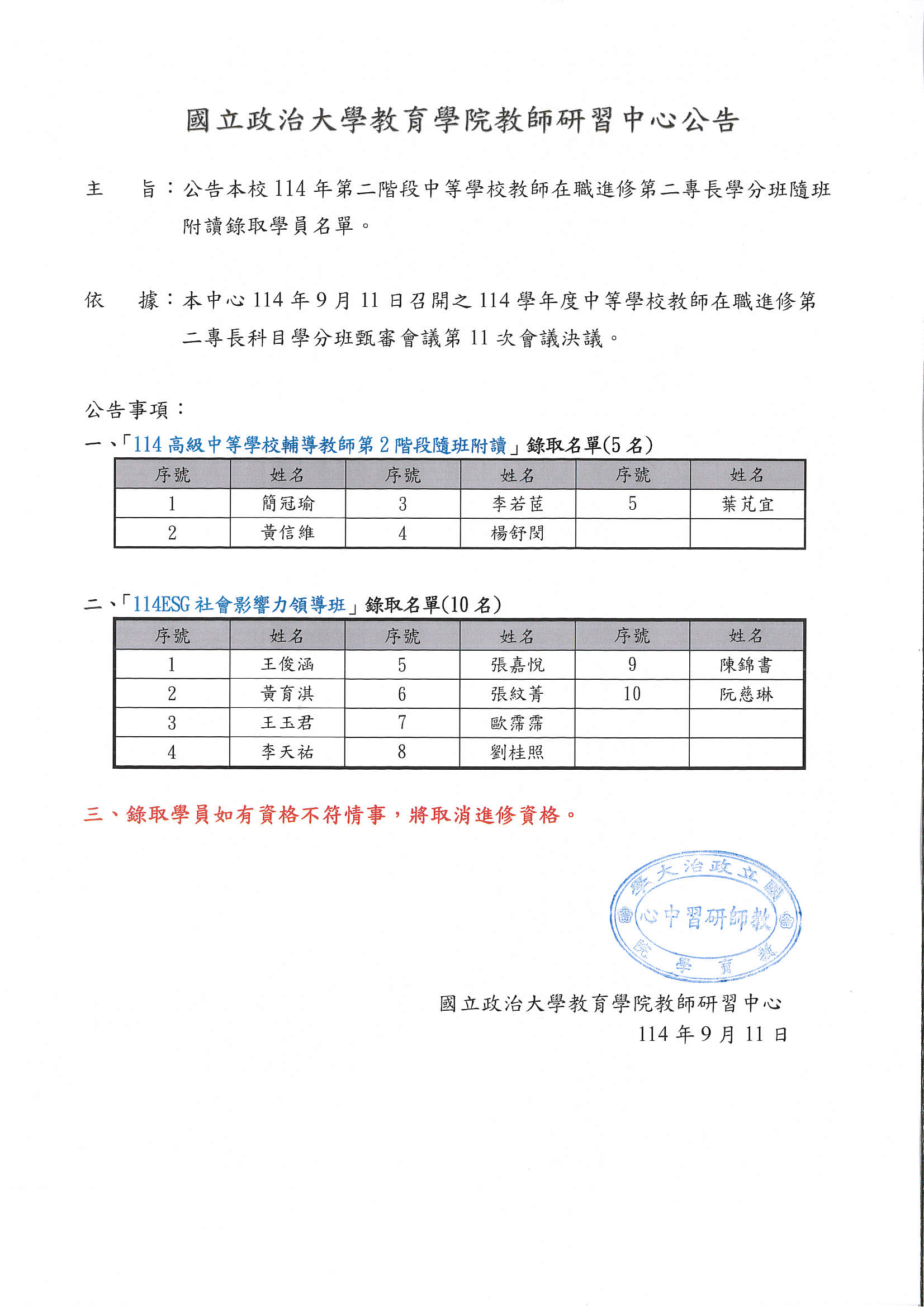 114 ESG社會影響力領導班、114中輔班隨班附讀錄取名單